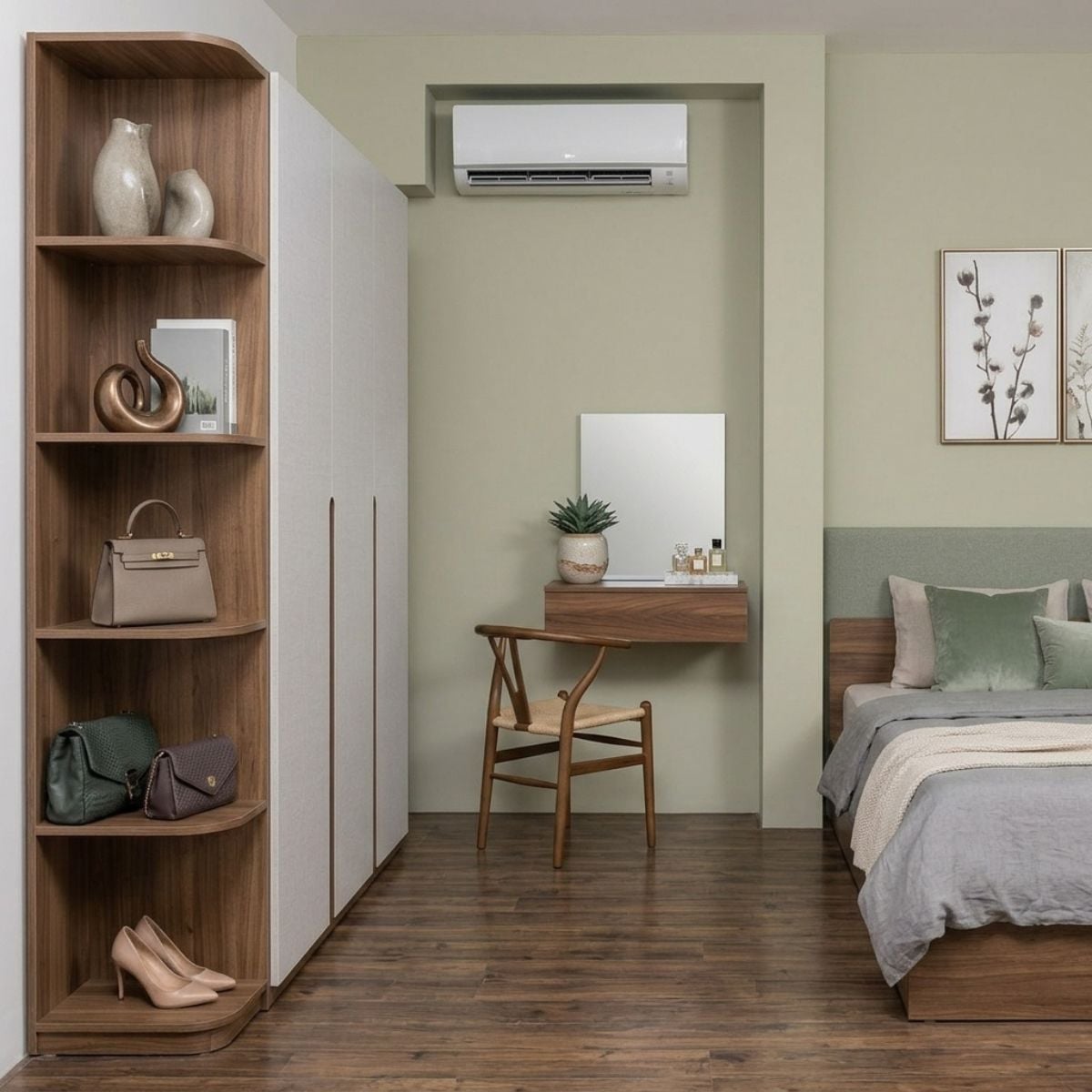 Mẫu bàn trang điểm trong Combo Phòng Ngủ có thiết kế đơn giản với gương hình chữ nhật đứng. Kết hợp đóng thêm 1 hộc để đựng mĩ phẩm, nhằm tăng không gian lưu trữ. Với bàn trang điểm này, chị em có thể thoải mái làm đẹp.