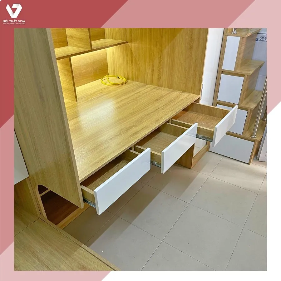 Giường tầng kiểu kết hợp bàn học thông minh, có ngăn kéo và giá sách.
