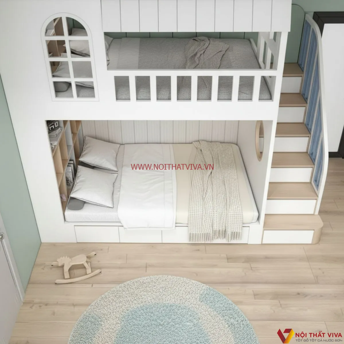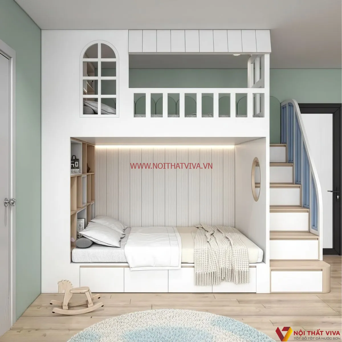 Giường 2 Tầng Gỗ Công Nghiệp Bền Bỉ Với Tông Màu Trắng Hiện Đại