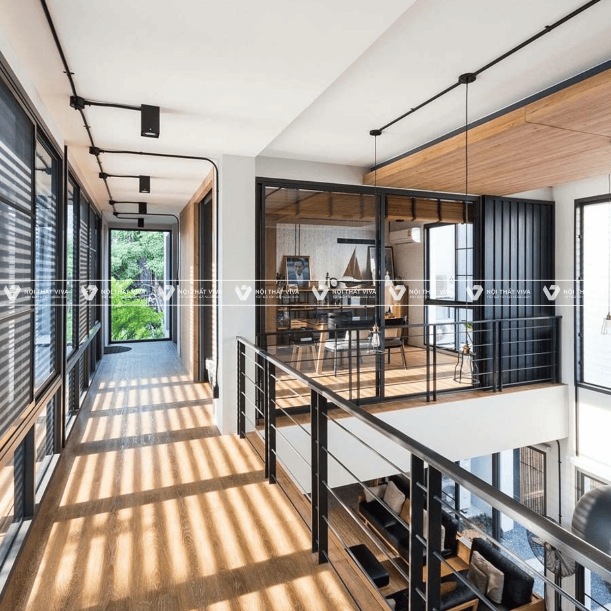 - Dùng cửa sổ lớn, giếng trời, vật liệu kính: Để tối đa ánh sáng, có thể mở rộng cửa sổ, tạo giếng trời ở khu vực giữa nhà hoặc ngay trên gác lửng. Ngoài ra, sử dụng vách ngăn kính hoặc lan can kính cho gác lửng cũng được xem là một ý tưởng tuyệt vời.