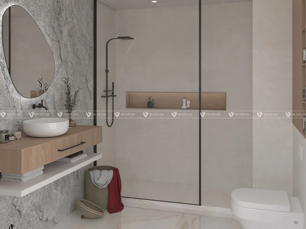 - Tiết kiệm diện tích: Với 1 diện tích phù hợp là đã đủ để sử dụng. Vách phòng tắm bằng kính có thiết kế tách biệt với các không gian khác như phòng ngủ, phòng ăn, phòng bếp, nhà vệ sinh….