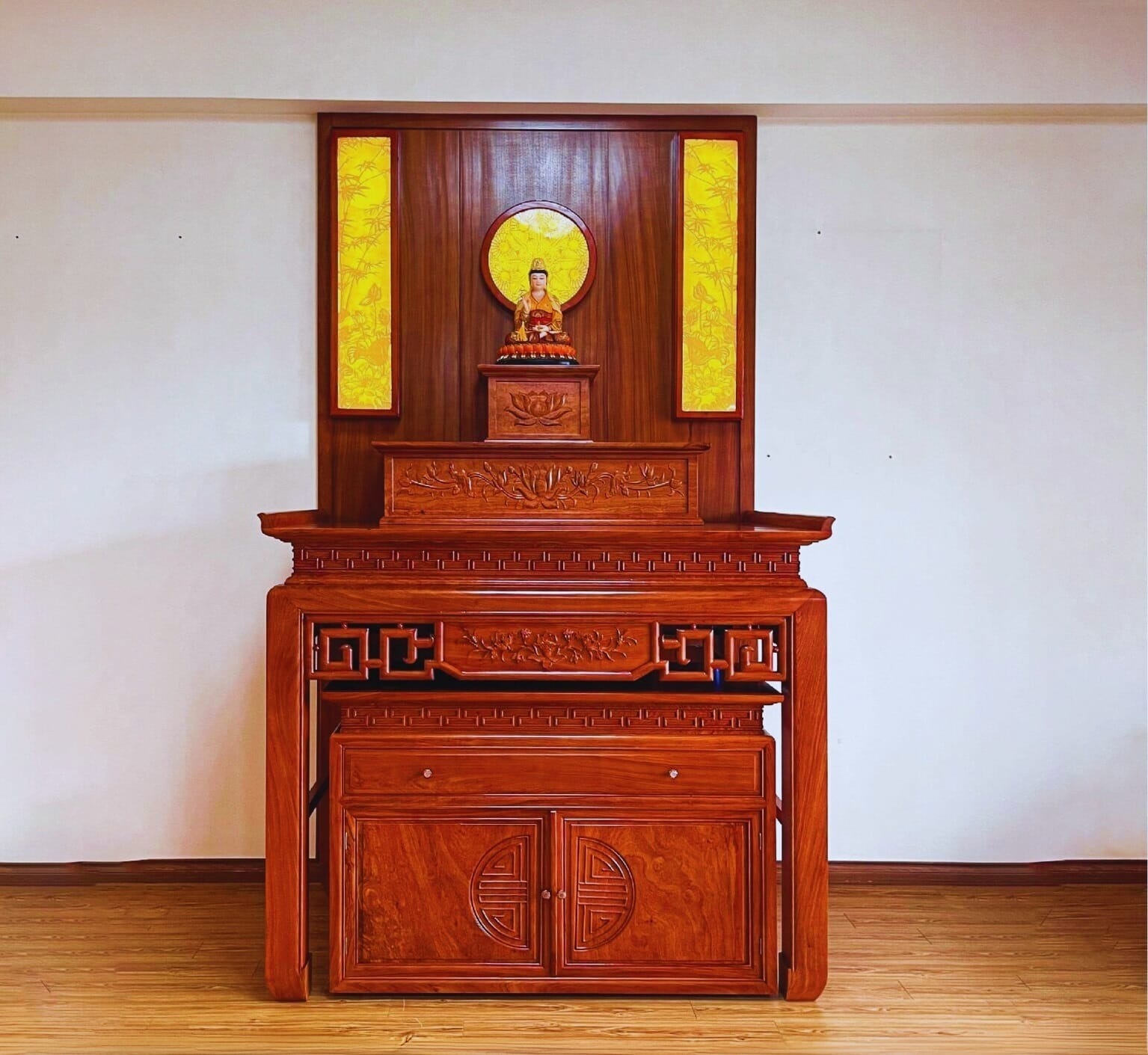 Tủ thờ dạng vây quanh là 4 bức vách, tạo không gian khép kín bên trong. Đặc biệt, thiết kế một mặt theo dạng cánh cửa mở ra mở vào, dùng để cất giữ và lấy đồ bên trong.
