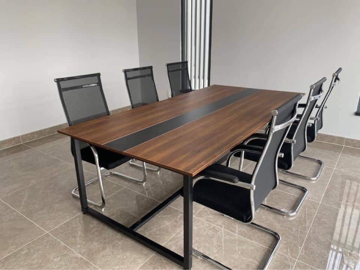 Mẫu bàn họp chân sắt 2m4 đặt tại vị trí trung tâm của căn phòng. Đảm bảo có sự kết nối hài hòa với tổng thể không gian chung.