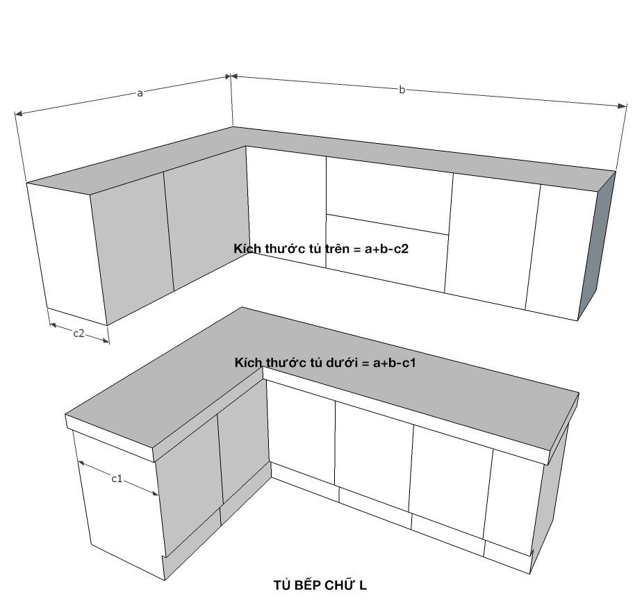 Để xác định kích thước tủ bếp chữ L theo mét dài. Gia chủ có thể tính bằng cách cộng tổng kích thước chiều dài tủ bếp chữ L và trừ đi chiều sâu của tủ bếp.